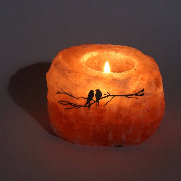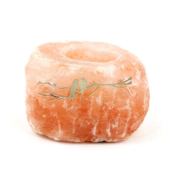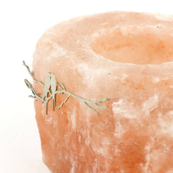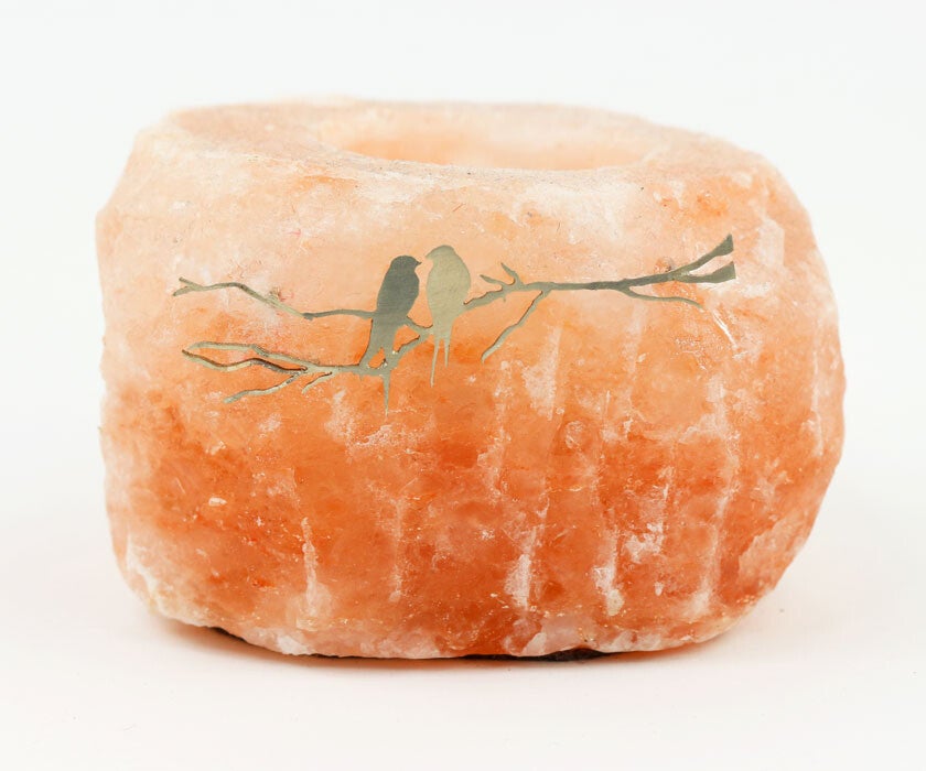 Dit zoutstenen lichtje heeft een silhouet van twee zwaluen die romantisch op een takje zitten. Het geheel is prachtig gedetailleerd met de hand uitgezaagd. Het silhouet is gemaakt van alpaca en is stevig bevestigd in de zoutsteen, welke wit-rozig is van kleur. Een waar sfeerlichtje voor de donkere dagen.