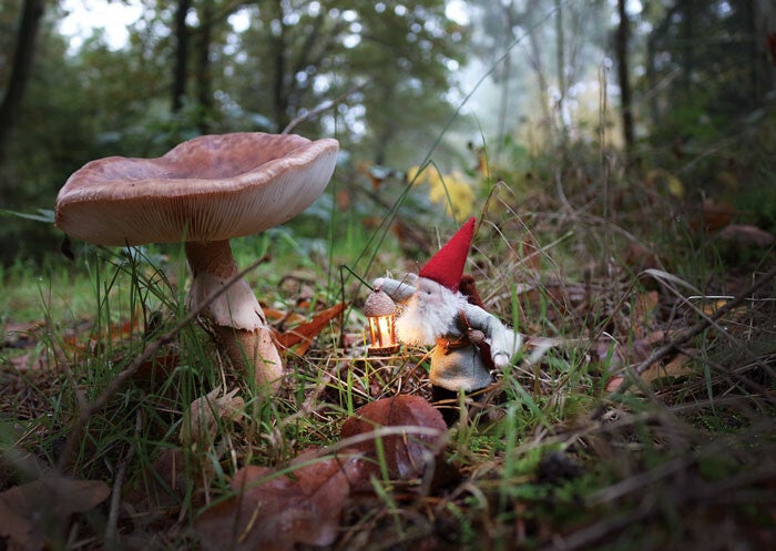 Dit is Elgin met de lantaarn. Deze kleine kabouter gaat er het liefst op uit in de vroege ochtendschemering om veel paddenstoelen te bezoeken