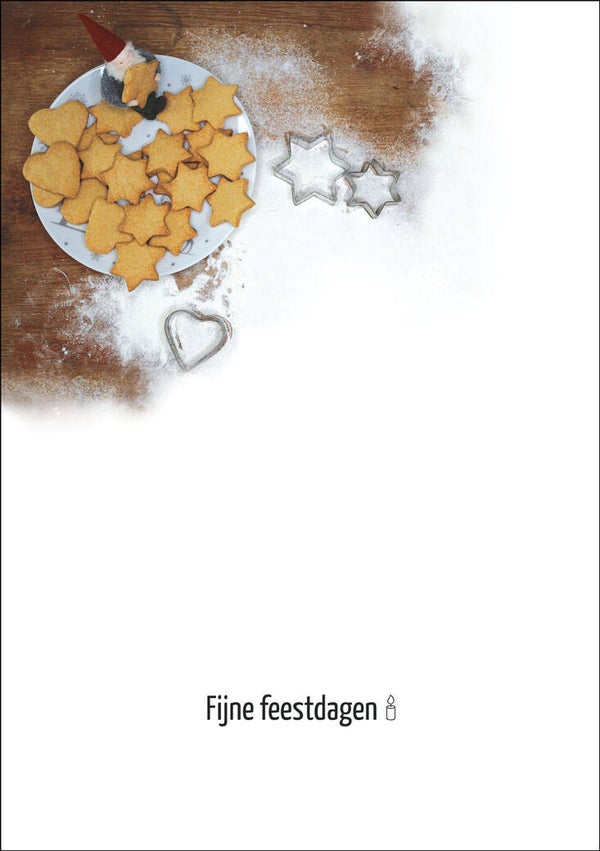 Set van 5 dubbele kerstkaarten van kabouter Lonan, terwijl hij een sneeuw-engel maakt in het meel wat op tafel achtergebleven was na het bakken van een heel bord heerlijke koekjes. Op de binnenkant kun je Mortyn van de koekjes zien smullen en is ruimte om je kerstwens op te schrijven.
