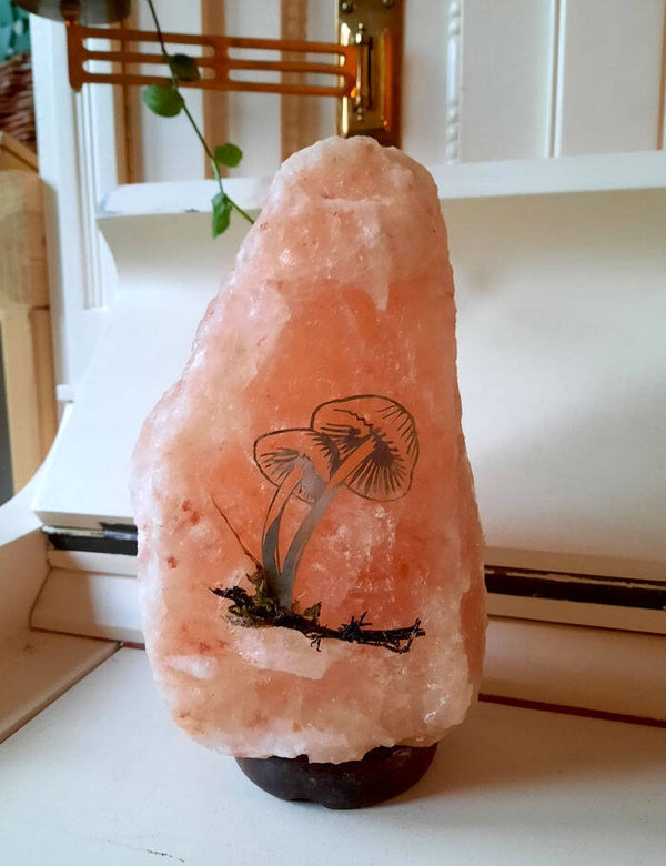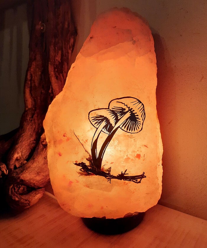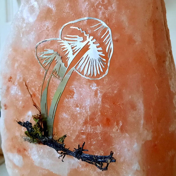 Deze zoutstenen lamp heeft een silhouet afbeelding van twee paddenstoelen. De silhouetten zijn gemaakt van alpaca en met de hand ragfijn uitgezaagd, stevig bevestigd in de zoutsteen.