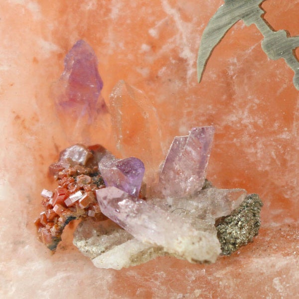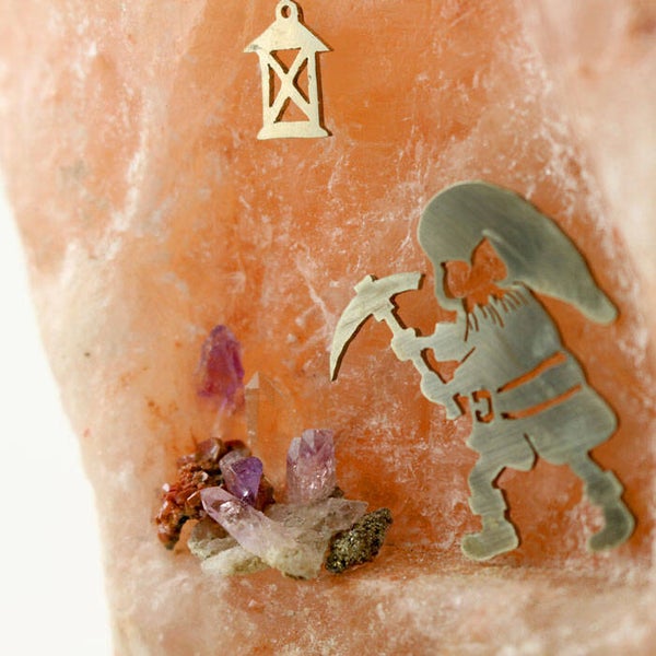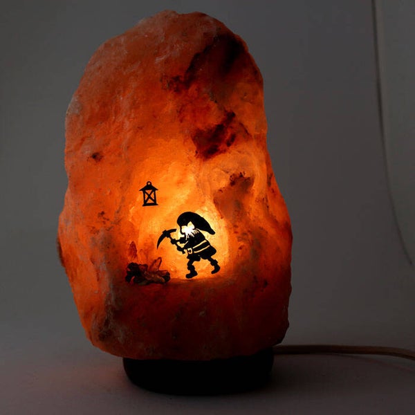 Deze zoutstenen lamp heeft een silhouet afbeelding van een kleine dwerg die aan het werk is in zijn grot. Het silhouet is gemaakt van alpaca, met de hand uitgezaagd, en de steentjes waar hij op in hakt zijn amethist, bergkristal en vanadeniet en pyriet. De silhouetten en steentjes zijn stevig bevestigd in de zoutsteen. De betreffende lamp is een rose zoutlamp, welke een warm geel-oranje uitstraling heeft wanneer de lamp aan staat. Een prachtige sfeerlamp, bijvoorbeeld voor op de kinderkamer.