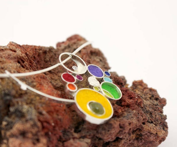 Deze prachtige zilveren hanger is uitgevoerd in eerste gehalte zilver. De hanger bestaat uit diverse grotere en kleinere cirkels, ingelegd met vilt. In cirkelvorm worden de kleuren van de regenboog doorlopen, beginnend (en eindigend) bij een opengewerkte en deels gematteerde cirkel met een zirconia. Verder is in de hanger een groene agaat en ziler smeltwerk verwerkt.