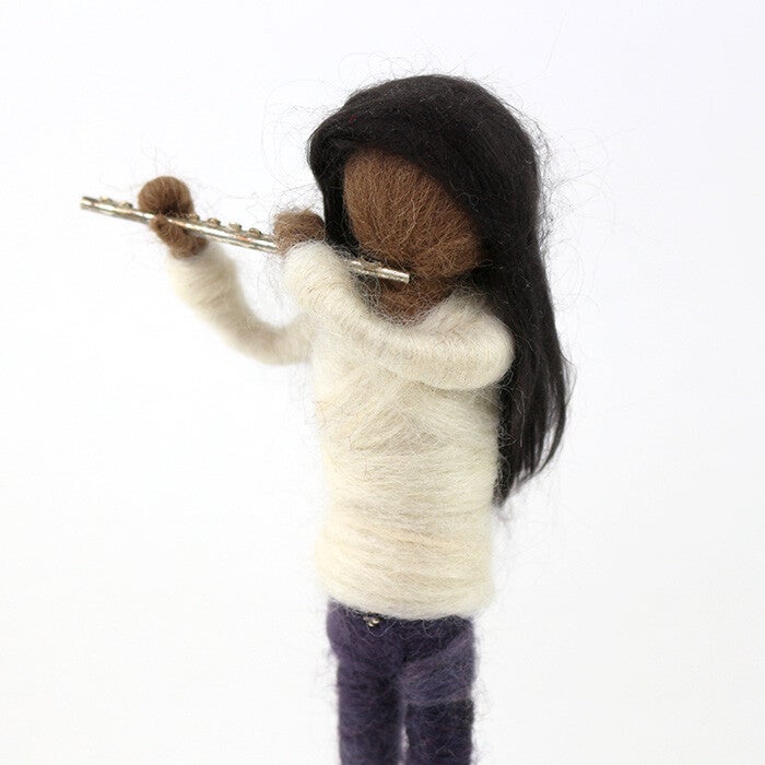 Deze viltsculptuur is volledig met de hand genaaldvilt. De vrouw heeft een lichtbruine huidskleur en draagt een gemêleerd paarse flair-broek en een wit truitje. Beide zijn gemaakt van merinowol met zijde. De dwarsfluit is gemaakt van zilver. Ook het knoopje op de broek is een zilver ornamentje. De sculptuur heeft verder lange zwarte (zijden) haren.