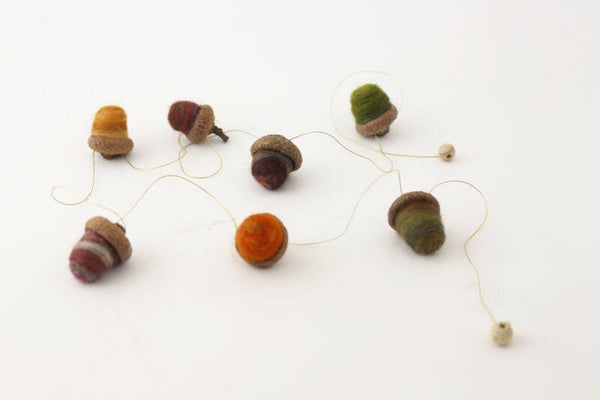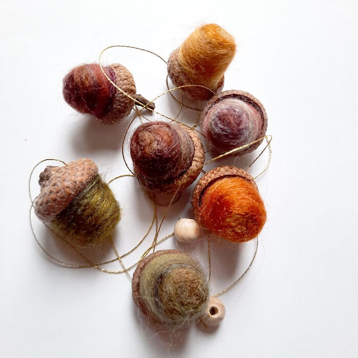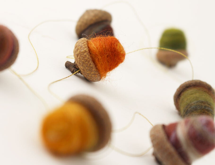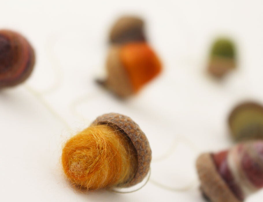 Slinger, gemaakt van gevilte eikeltjes. De eikeltjes, met hoedjes van een Amerikaanse eik, zijn naaldgevilt van merinowol met zijde en de hoedjes zijn met gouddraad aan elkaar verbonden. De slinger is ca. 100 cm lang en bestaat uit 7 eikeltjes in de gemêleerde herfstkleuren geel-oranje-groen-bruin.