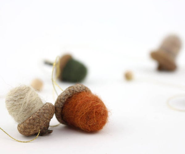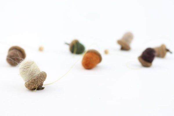 Slinger, gemaakt van gevilte eikeltjes. De eikeltjes, met hoedjes van een Amerikaanse eik, zijn naaldgevilt van grovere natuurlijke wol (van wit via rood en groen tot donker bruin) en de hoedjes zijn met gouddraad aan elkaar verbonden. De slinger is ca. 80 - 90 cm lang en bestaat uit 7 eikeltjes.