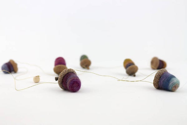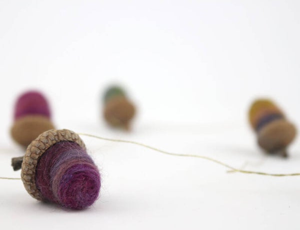 Slinger, gemaakt van gevilte eikeltjes. De eikeltjes, met hoedjes van een Amerikaanse eik, zijn naaldgevilt van overwegend gemêleerd paars (en verder bruin/groene) merinowol met zijde en de hoedjes zijn met gouddraad aan elkaar verbonden. De slinger is ca. 100 cm lang en bestaat uit 7 eikeltjes.