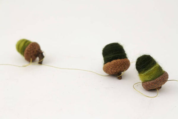 Slinger, gemaakt van gevilte eikeltjes. De eikeltjes, met hoedjes van een Amerikaanse eik, zijn naaldgevilt van gemêleerd groene merinowol met zijde en de hoedjes zijn met gouddraad aan elkaar verbonden. De slinger is ca. 100 cm lang en bestaat uit 7 eikeltjes.