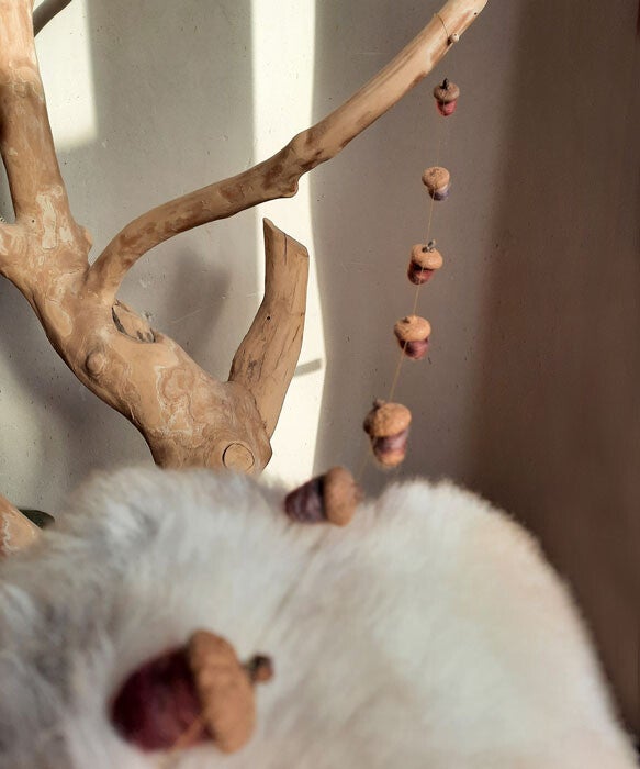 Slinger, gemaakt van gevilte eikeltjes. De eikeltjes, met hoedjes van een Amerikaanse eik, zijn naaldgevilt van merinowol met zijde en de hoedjes zijn met gouddraad aan elkaar verbonden. De slinger is ca. 100 cm lang en bestaat uit 7 eikeltjes in de kleur bordeau rood met bruin gemêleerde tinten.