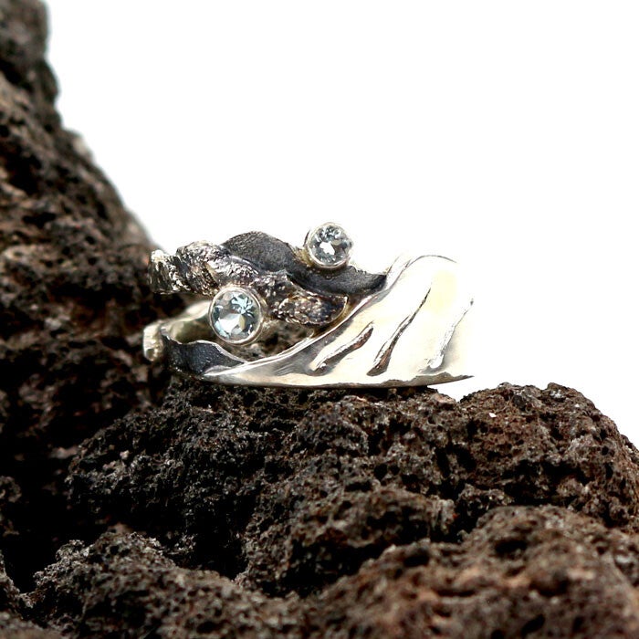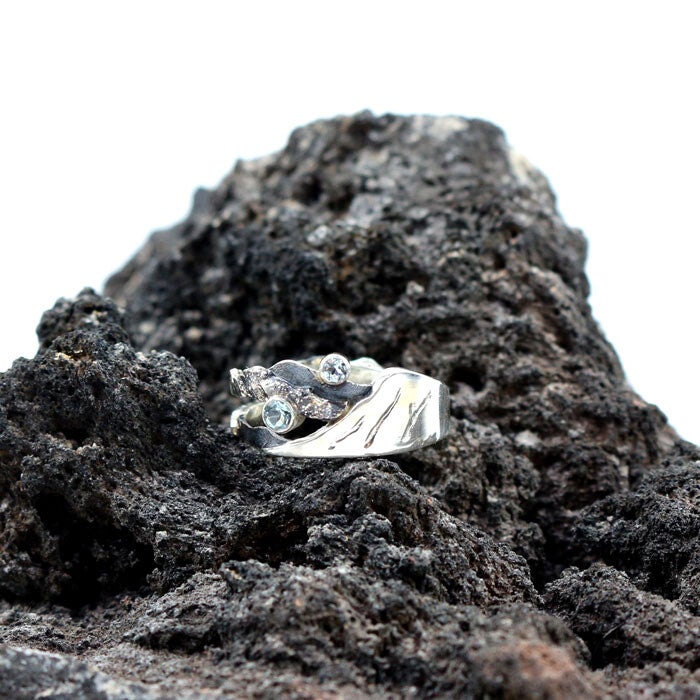 Deze elegante ring is uitgevoerd in eerste gehalte zilver en ingezet met twee aquamarijn-stenen: een van 3 mm en een van 2,5 mm. De ring omvat de contour van de berg 'Reykjaneshyrna' (Westfjorden, IJsland) in hoogglans zilver. De achtergrond betreft gereticuleerd zilver, dat deels zwart is gemaakt (dmv blitzbeits), hetgeen de nachtelijke nevelen voorstellen waartegen de berg zich aftekent. De twee aquamarijn-stenen stellen de sterren aan de nachtelijke hemel voor.