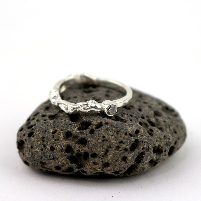 Deze ring is uitgevoerd in eerste gehalte zilver en bestaat uit gereticuleerd zilver en hoogglans zilver, aan elkaar verbonden met een zirconia-steen (3 mm). De combinatie van grillig smeltwerk en sierlijk hoogglans geeft de ring een speels karakter.