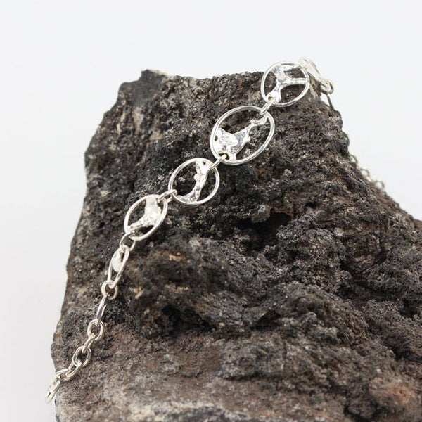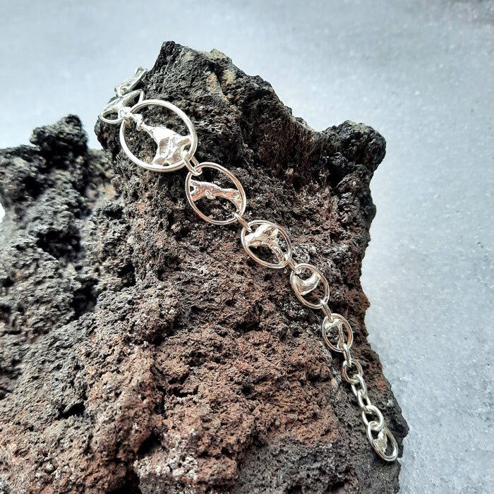 Deze prachtige schakelarmband is gemaakt van eerste gehalte zilver. Het bevat een serie schakels (oplopend van klein naar groot naar klein) met daarin gereticuleerd zilver verwerkt, hetgeen stromend lava voorstelt. De schakels zijn aan elkaar verbonden middels kleine ovale oogjes.