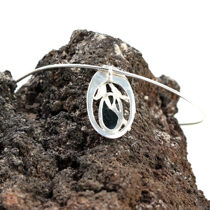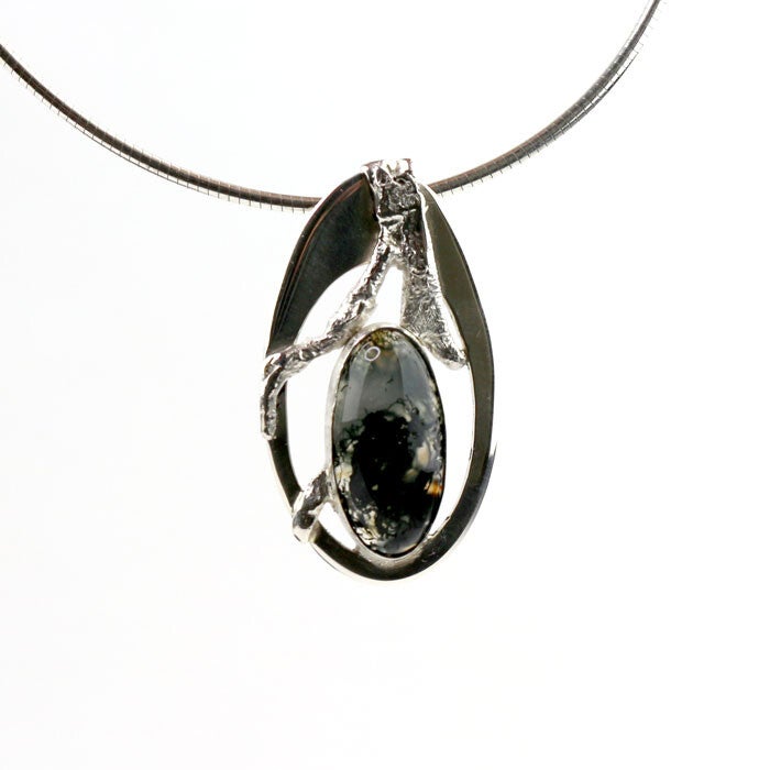 Deze elegante zilveren hanger is uitgevoerd in eerste gehalte zilver, met een prachtige mosagaat. Een mooie combinatie van een hoogglans gepolijste ovaalvorm met daaroverheen 'gedrapeerd' een stroom lava, uitgevoerd in gesmolten zilver hetgeen een spannend contrast met de ondergrond vormt. In de hanger is een grote mosagaat (0,9 bij 1,8 cm) gezet. Doordat de zetkast aan de achterzijde open is afgewerkt, haalt het licht de prachtige aderstructuur van de steen naar voren.