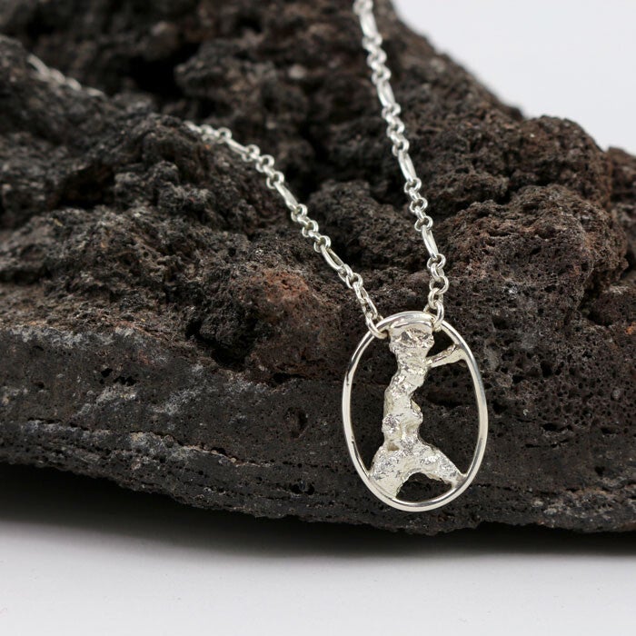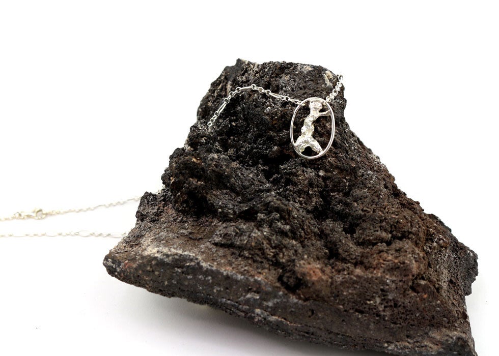 Deze hanger betreft een ovaalvormige draad-schakel met daarin gereticuleerd zilver, in de vorm van stromend lava.