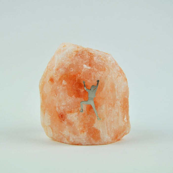 Dit roze zoutstenen nachtlampje heeft een silhouet afbeelding van een klimmer er op bevestigd, waardoor het lijkt alsof zij deze 'gigantische rots cq. berg' aan het beklimmen is (werkelijke hoogte zoutsteen = 8 cm).