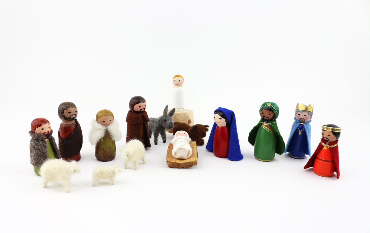 Deze 15 delige kerstgroep is gemaakt van peggdolls, met de hand hand beschilderd en aangekleed met wolvilt. De diertjes zijn dmv naaldvilten gemaakt. Het kindje ligt in een kribbe, uit stevig schors gesneden.