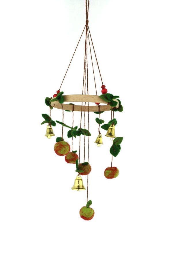 Mobile / hanger gemaakt van houten ring van 10 cm doorsnee met 8 blozende wolvilten appeltjes, 6 belletjes en kralen. Totale hoogte 30 cm (ongeveer).