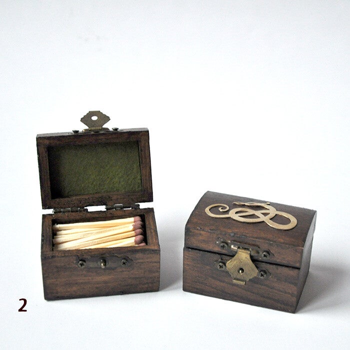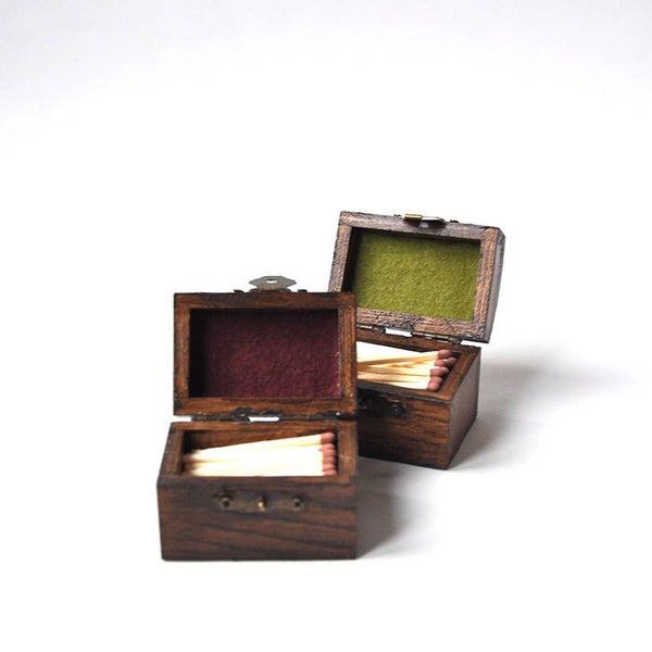 Het doosje is afgewerkt met een donkerbruine wengé-beits en is aan de binnenzijde afgewerkt met bordeaurood (nr. 1) of bladgroen (nr. 2) wolvilt (zie foto's). Aan de achterzijde van het kistje is een strijkvlakje aangebracht waarop de lucifers kunnen worden ontstoken.