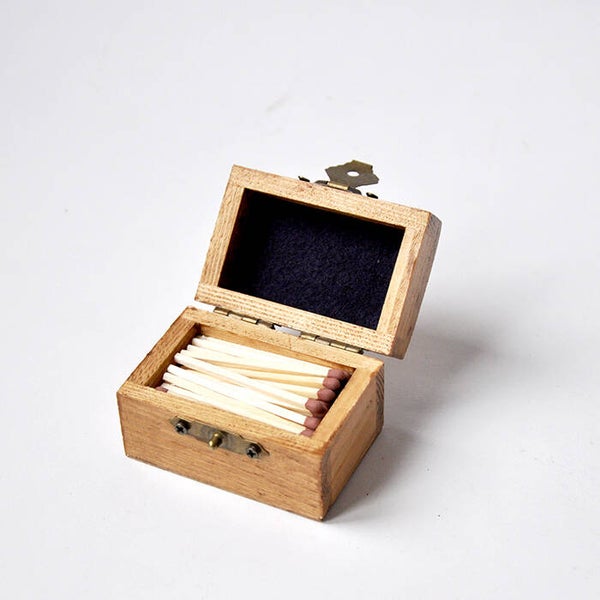 Het doosje is afgewerkt met een lichtbruine noten-beits en is aan de binnenzijde afgewerkt met nachtblauw wolvilt. Aan de achterzijde van het kistje is een strijkvlakje aangebracht waarop de lucifers kunnen worden ontstoken.