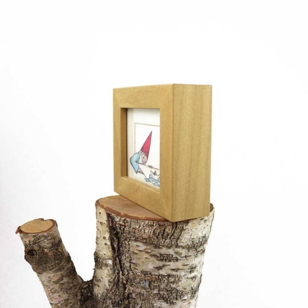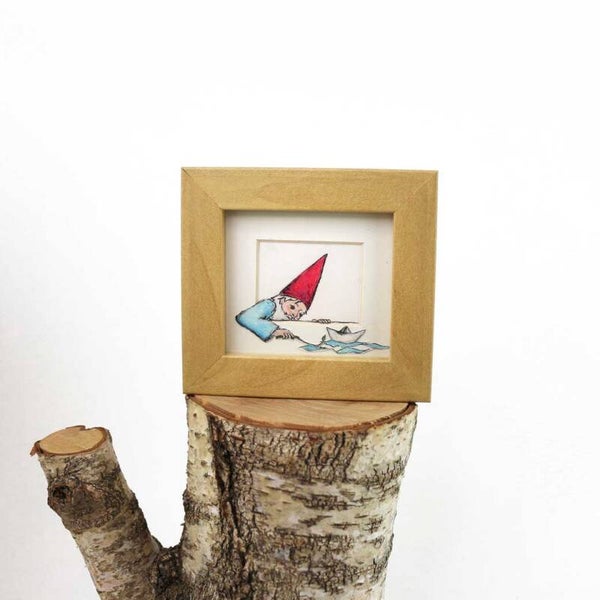 Dit kaboutertje speelt met een papieren bootje in zijn schilderijtje.