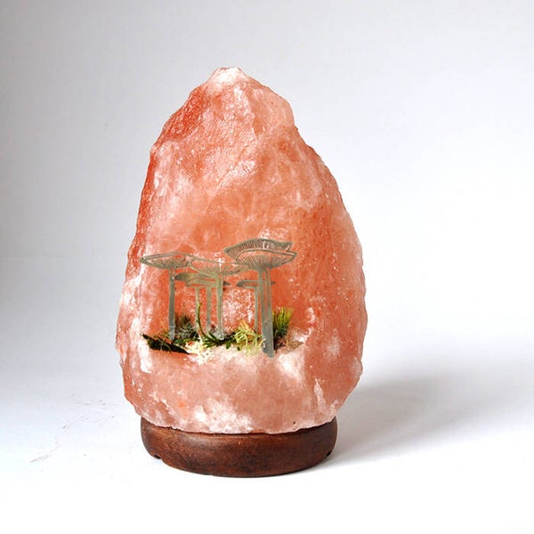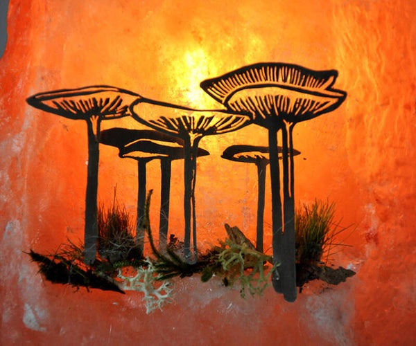 Deze zoutstenen lamp heeft een silhouet afbeelding van een groep zwammen. De silhouetten zijn gemaakt van alpaca en met de hand ragfijn uitgezaagd, stevig bevestigd in de zoutsteen. Doordat ze in verschillende lagen zijn aangebracht, wordt extra diepte gecreëerd aan het totaal. De zwammen staan in een 'bos-achtige' ondergrond, gemaakt van diverse mossen en hout. De schimmeldraden onderin zijn van witte zijde.