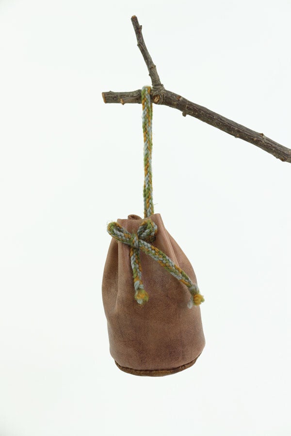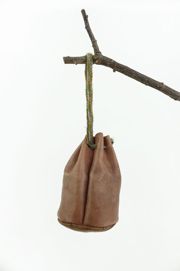 Leren buidel, gemaakt naar historisch model, met een moderne uitstraling. De buidels zijn gemaakt van gerecycled leer en/of restmateriaal. Verfraaid met gevlochten bandje van wollen garen, welke met plantaardige verfstoffen geverfd is.