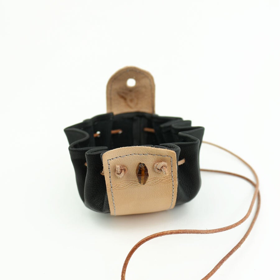 Leren buideltje aan een leren koord, die als een harmonica uitvouwt tot een ruime pouch. In het leer is een vlechtmotief gestempeld en op de klep is een afbeelding van een triquetra te zien. De buidels zijn gemaakt van blauw gerecycled leer en natuurlijk gelooid leer.