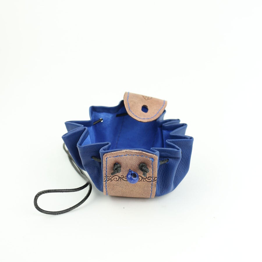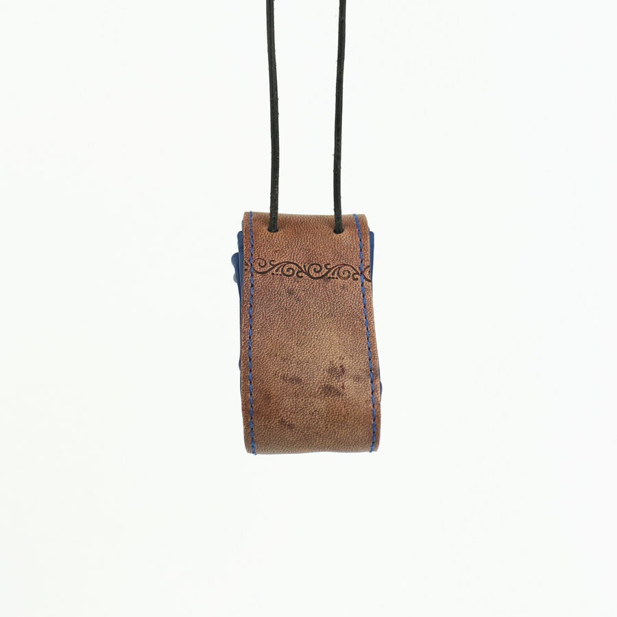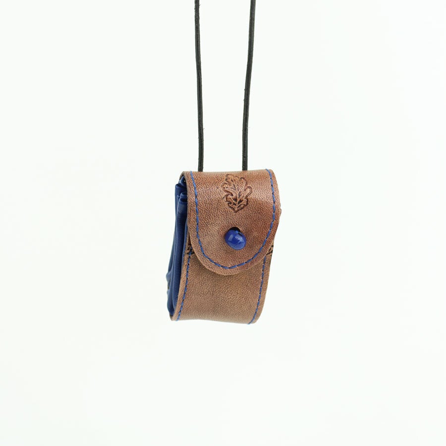 Leren buideltje aan een leren koord, die als een harmonica uitvouwt tot een ruime pouch. In het leer is een krulmotief gestempeld en op de klep is een afbeelding van een eikenblad te zien. De buidels zijn gemaakt van blauw gerecycled leer en natuurlijk gelooid leer.