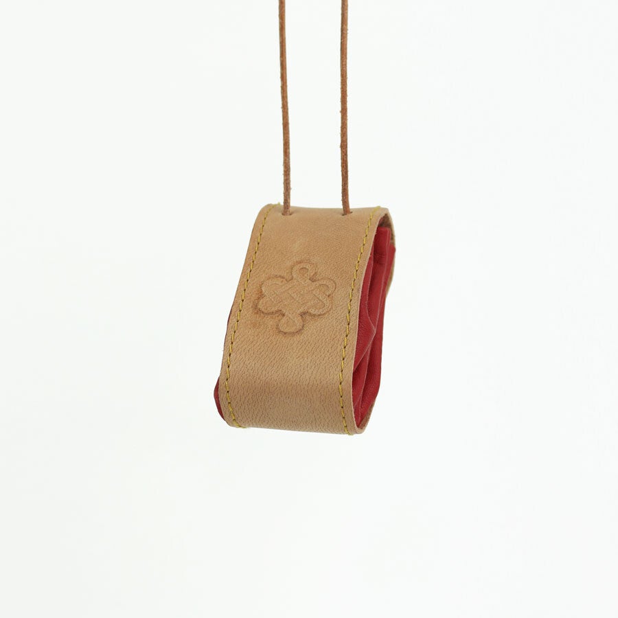 Leren buideltje aan een leren koord, die als een harmonica uitvouwt tot een ruime pouch. In het leer is een keltisch motief gestempeld en op de klep is een afbeelding van een eikenblad te zien. De buidels zijn gemaakt van rood gerecycled leer en natuurlijk gelooid leer.