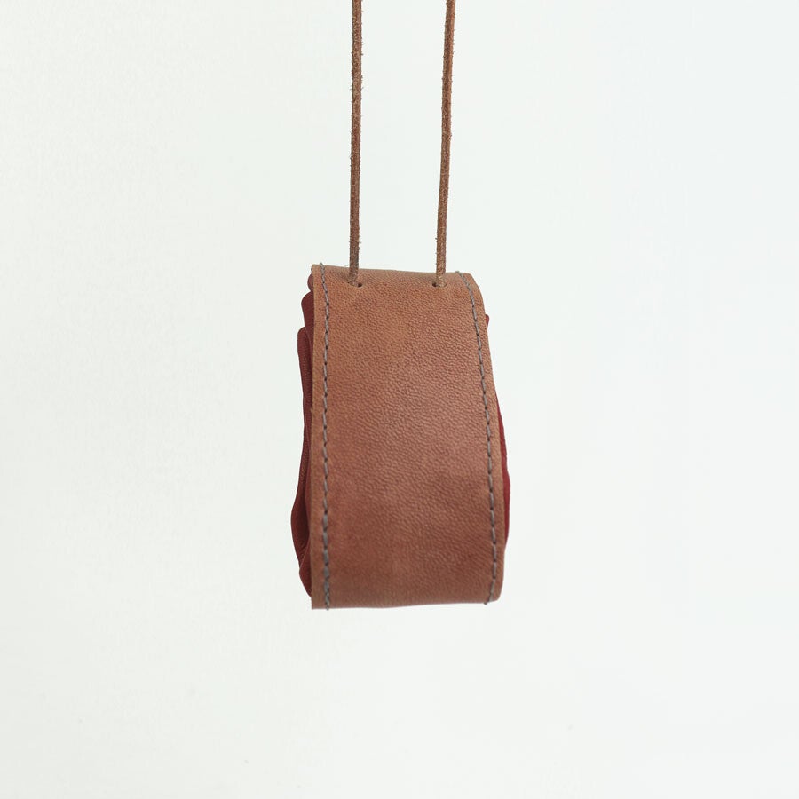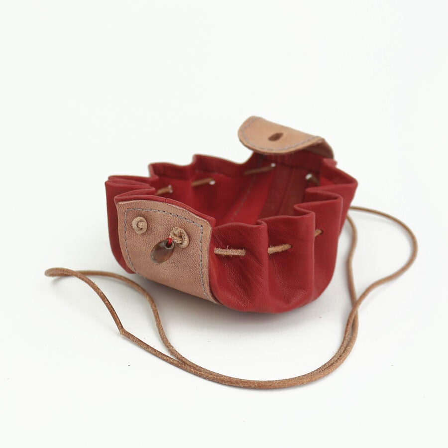 Leren buideltje aan een leren koord, die als een harmonica uitvouwt tot een ruime pouch. In het leer is op de klep een afbeelding van een keltisch motief te zien. De buidels zijn gemaakt van rood gerecycled leer en natuurlijk gelooid leer.
