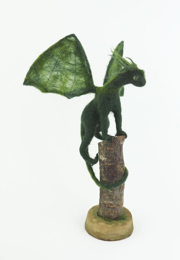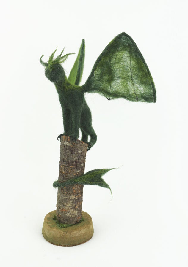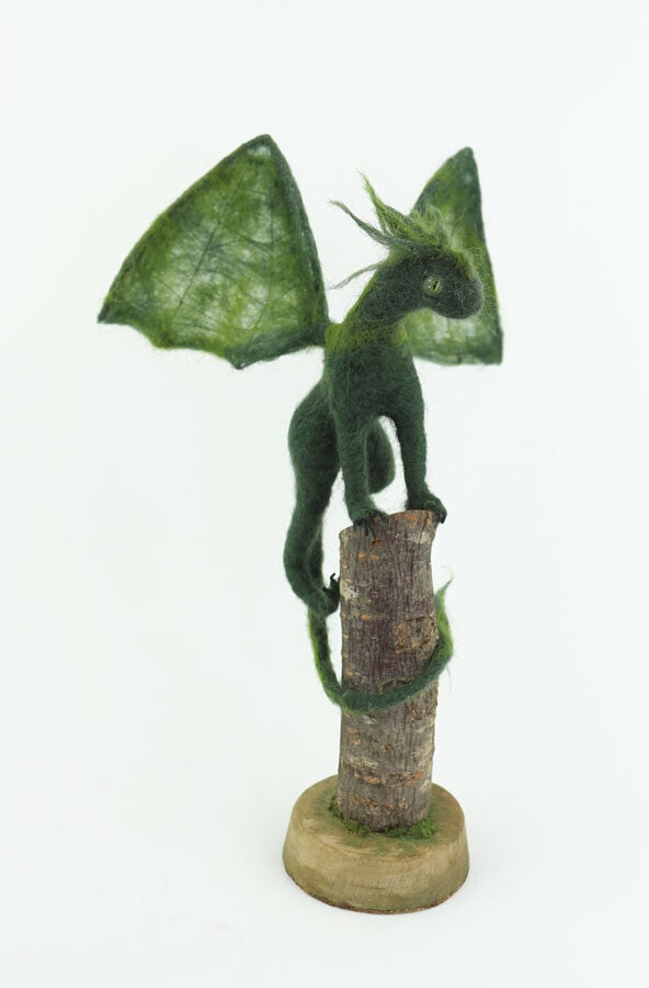 Naaldgeviltte groene draak. De wol is natuurlijk geverfd met wede en wouw en over een frame van stevig ijzerdraad geprikvilt. Haar drakenogen zijn van glas.