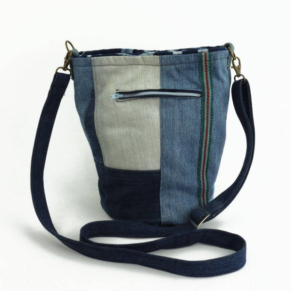 Deze tas is helemaal met gerecyclede materialen gemaakt, zoals spijkerbroeken en gevoerd met gebatikte stof.