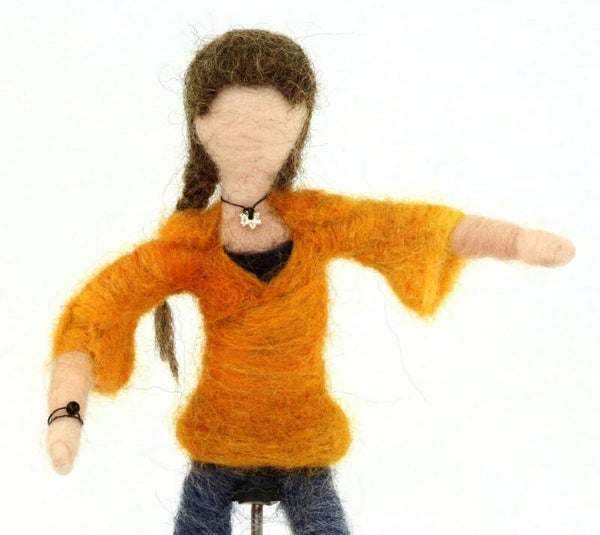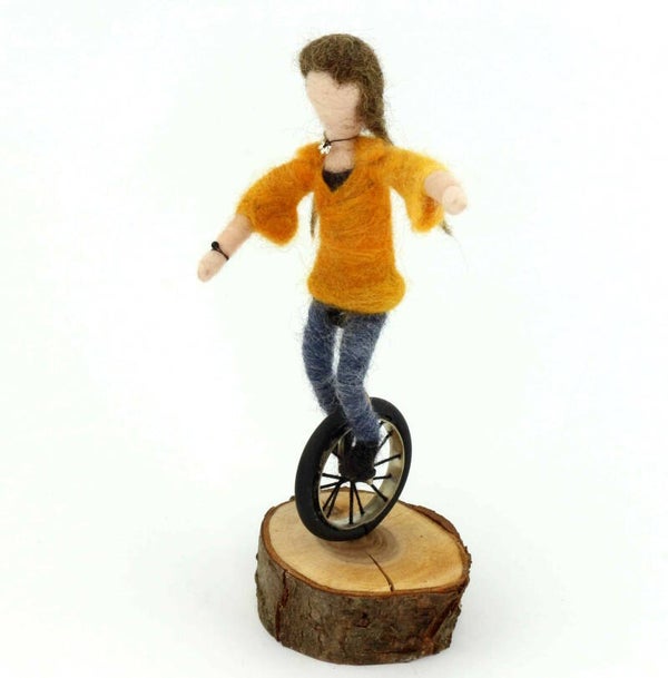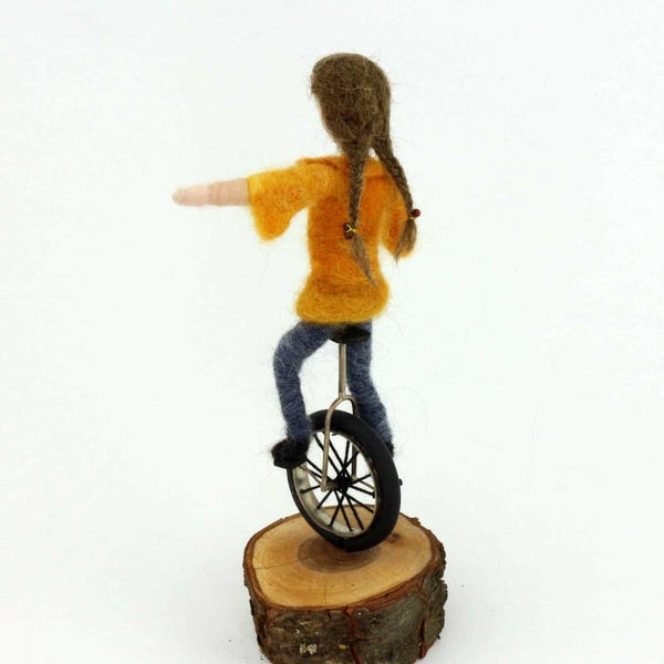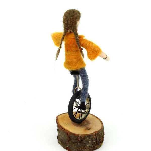 Deze viltsculptuur van een meisje, fietsend op een eenwieler, is volledig met de hand genaaldvilt. Het meisje draagt een spijkerbroek en een geel gemêleerd truitje met V-hals. Ze draagt verder een zilveren kettinkje en draagt haar lange bruine haar in twee vlechten.