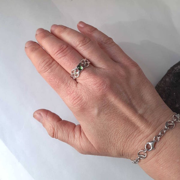 De ring is uitgevoerd in hoogglans zilver, de sierlijke vorm is geheel ragfijn met de hand uitgezaagd en ingefreesd. De ring is afgewerkt met een ovalen, olijfgroene toermalijn steen.
