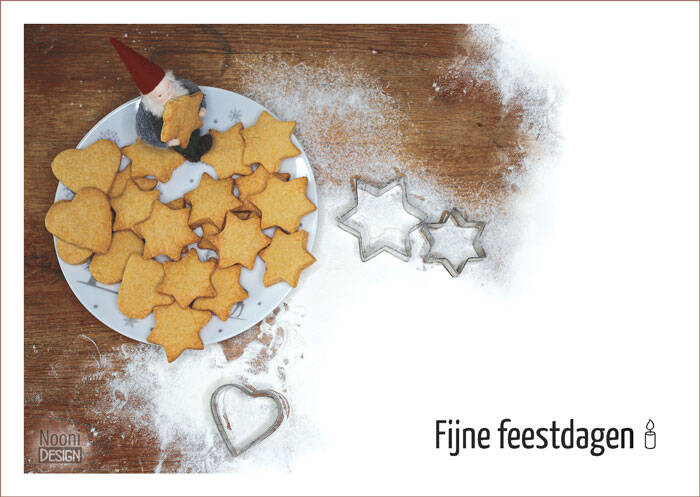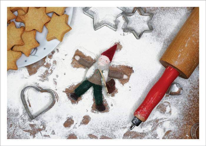 Kerstkaart van kabouter Lonan, terwijl hij een sneeuw-engel maakt in het meel wat op tafel achtergebleven was na het bakken van een heel bord heerlijke koekjes. Op de achterkant kun je Mortyn van de koekjes zien smullen en is ruimte om je kerstwens op te schrijven.