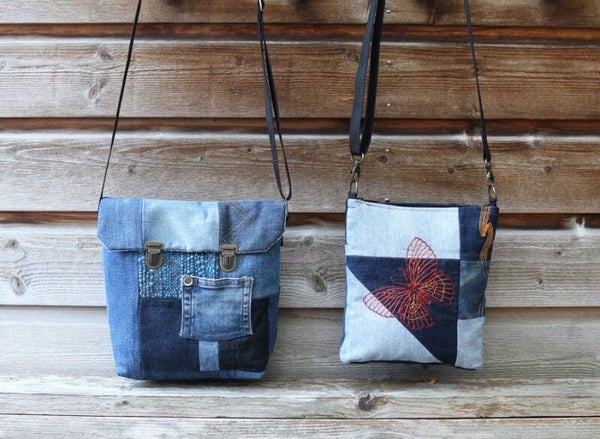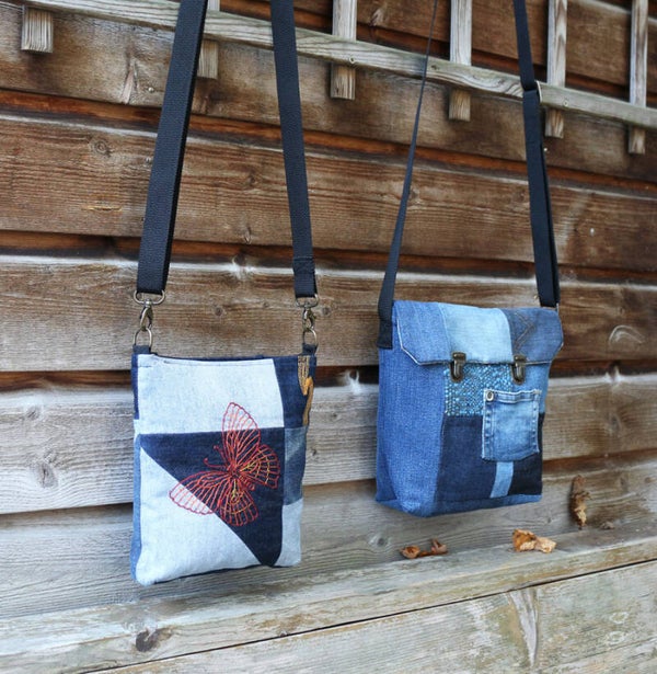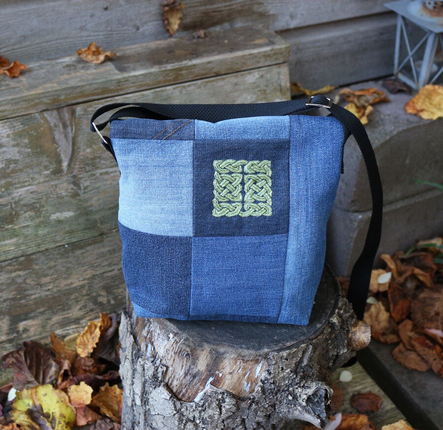 Deze tas is helemaal met gerecyclede materialen gemaakt, zoals spijkerbroeken en gevoerd met gebloemde stof. De tas heeft een klep die sluit met twee gespen. Op de achterkant is in groen keltisch vlechtwerk geborduurd.