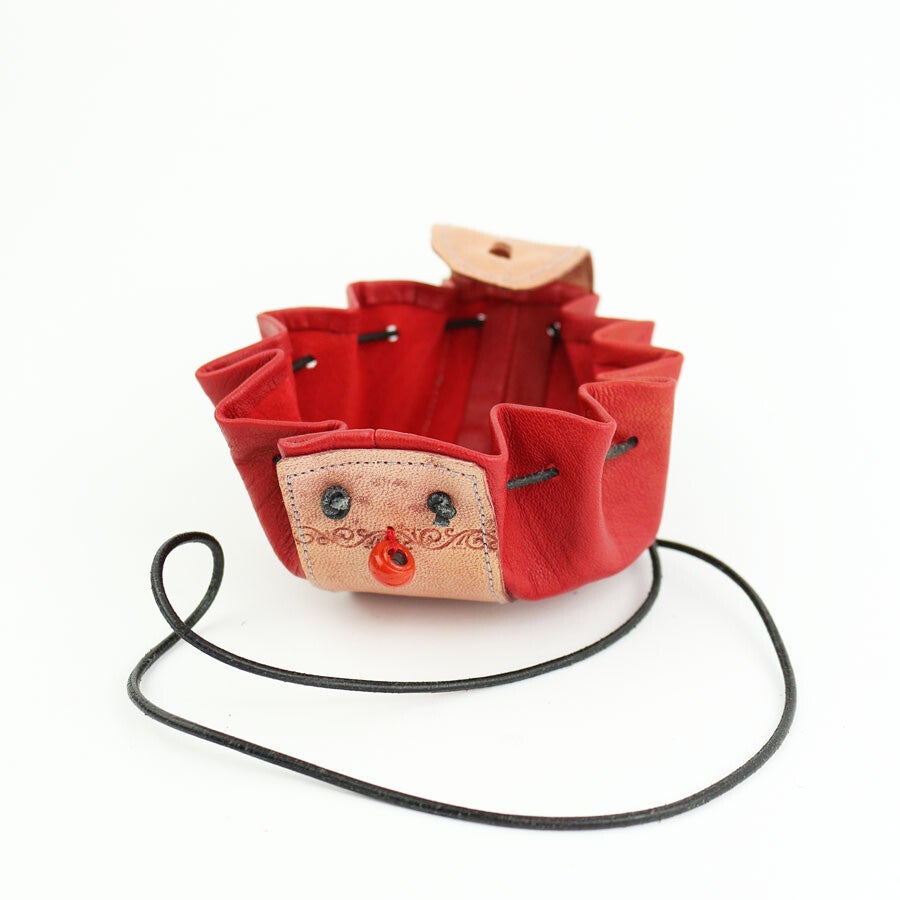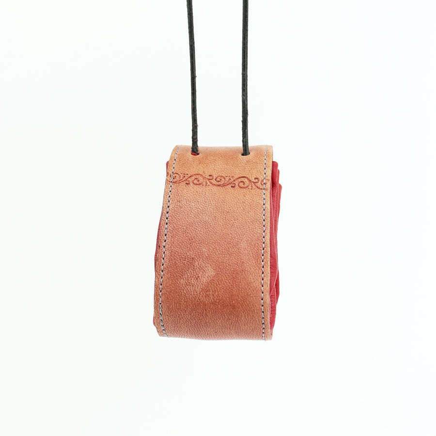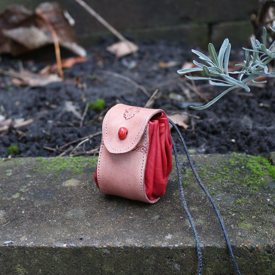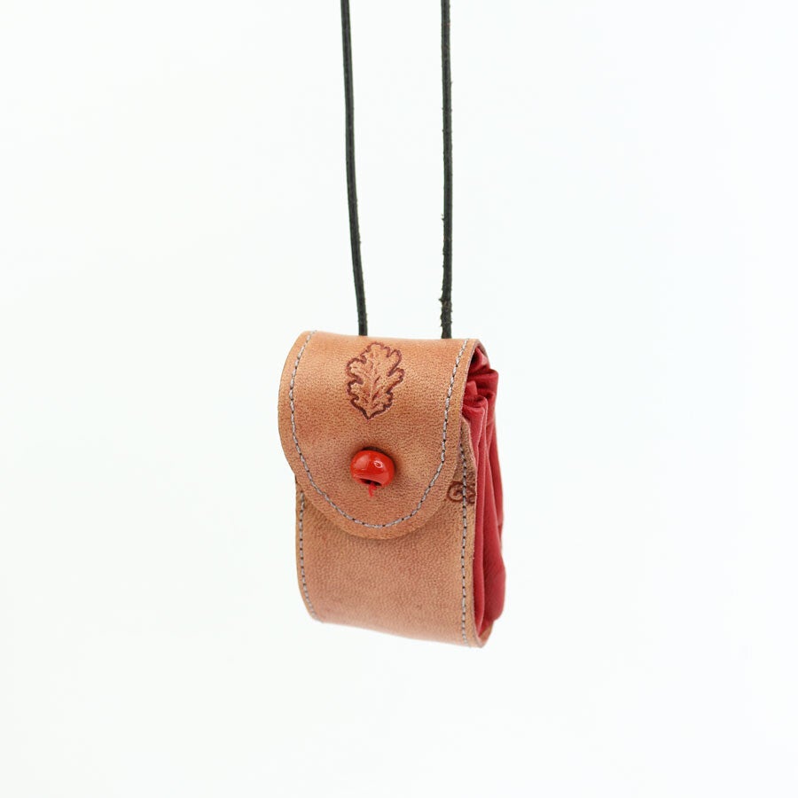 Leren buideltje aan een leren koord, die als een harmonica uitvouwt tot een ruime pouch. In het leer is een vlechtmotief gestempeld en op de klep is een afbeelding van een eikenblad te zien. De buidels zijn gemaakt van rood gerecycled leer en natuurlijk gelooid leer.